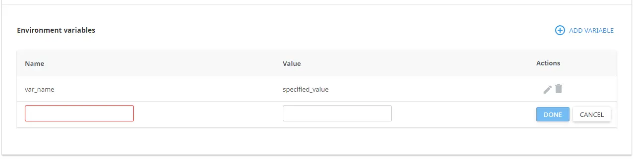 Optionally, add environment variable. To do so, click Add Variable and specify variable name and value, then click the Done or Cancel to close an adding form.