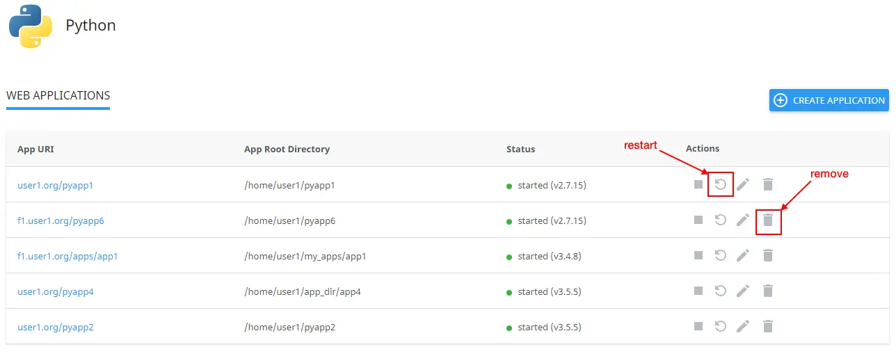 - Actions — allows to migrate, start, restart, stop, edit, and remove a particular application.